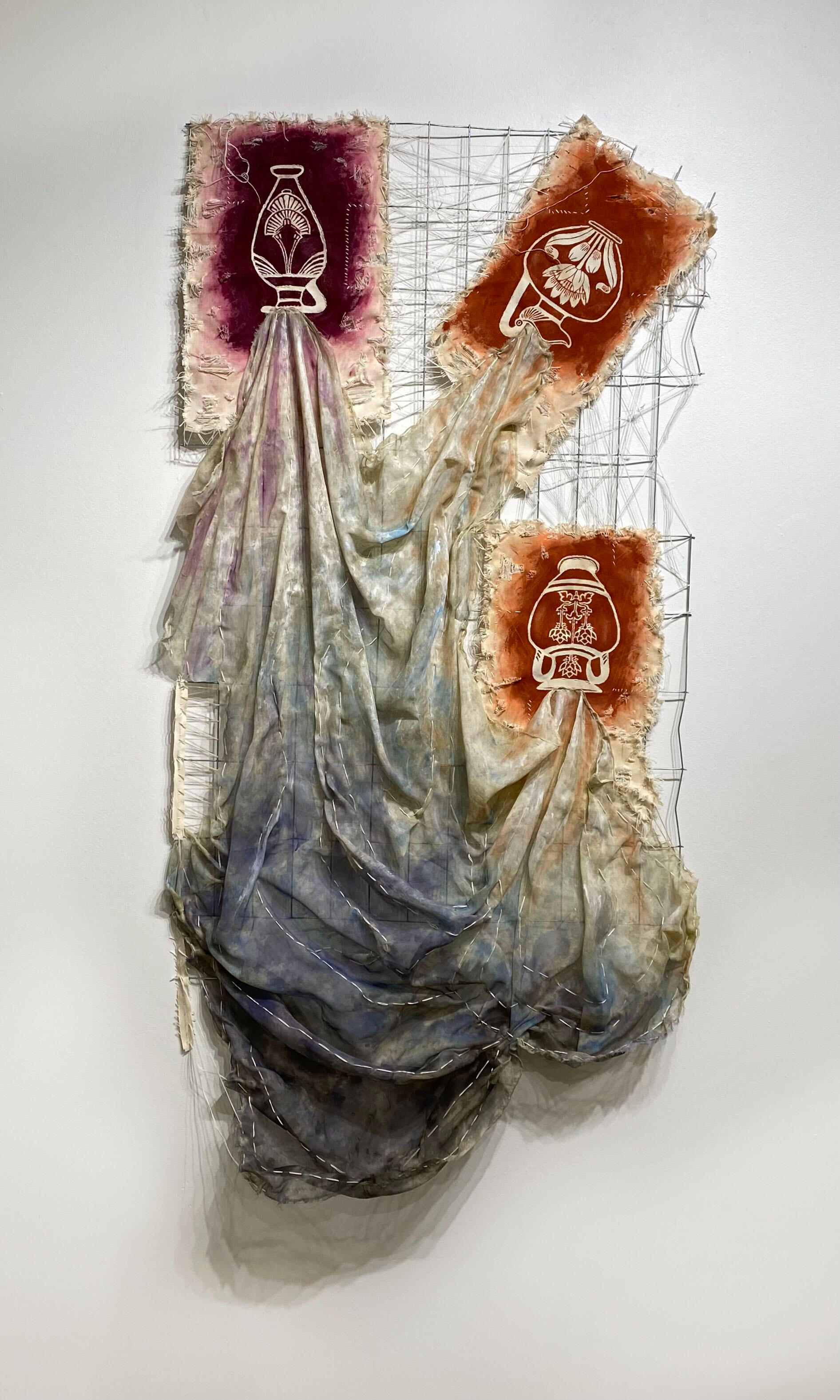 I forage natural dye materials from important sites mentioned in stories and found in my own research. I use the natural dyes on exclusively found fibers. I use a combination of aged found materials to reflect the history of the objects before they came into my possession. I also include rough hand stitching, loose threads, and imperfect/blemished materials in my work. This is to make my hand visible in the work, and to provide a contrast to the predominantly mass-manufactured (perfect) items and imagery all around us.