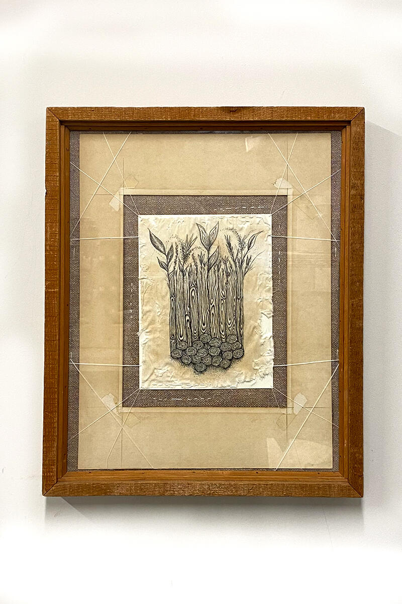 From the gathered stories, I depict different motifs that physically represent imagery communicated as memories, thoughts, and experiences. This imagery often manifests as flora & fauna, buildings/homes, objects and portraiture. I use ink to draw these images on different fibers and paper substrates, and I often use stitching as markmaking to embed the images in the material.